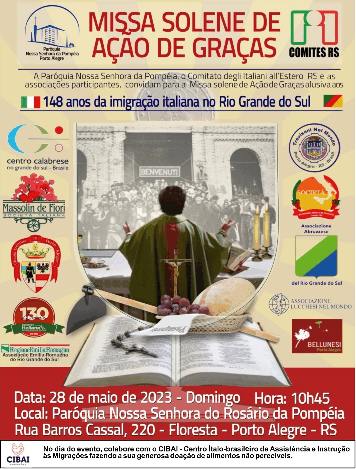 No dia 28 de maio de 2023, às 10h45 min, realizou-se a Missa Solene de Ação de Graças alusiva aos 148 anos da imigração italiana no Rio Grande do Sul, organizada por diversas entidades de origem italiana, na Paróquia Nossa Senhora da Pompéia, em Porto Alegre. A Associação Lucchesi nel Mondo de Porto Alegre foi representada, na ocasião, pelo associado e membro da diretoria Loredan Fiori.