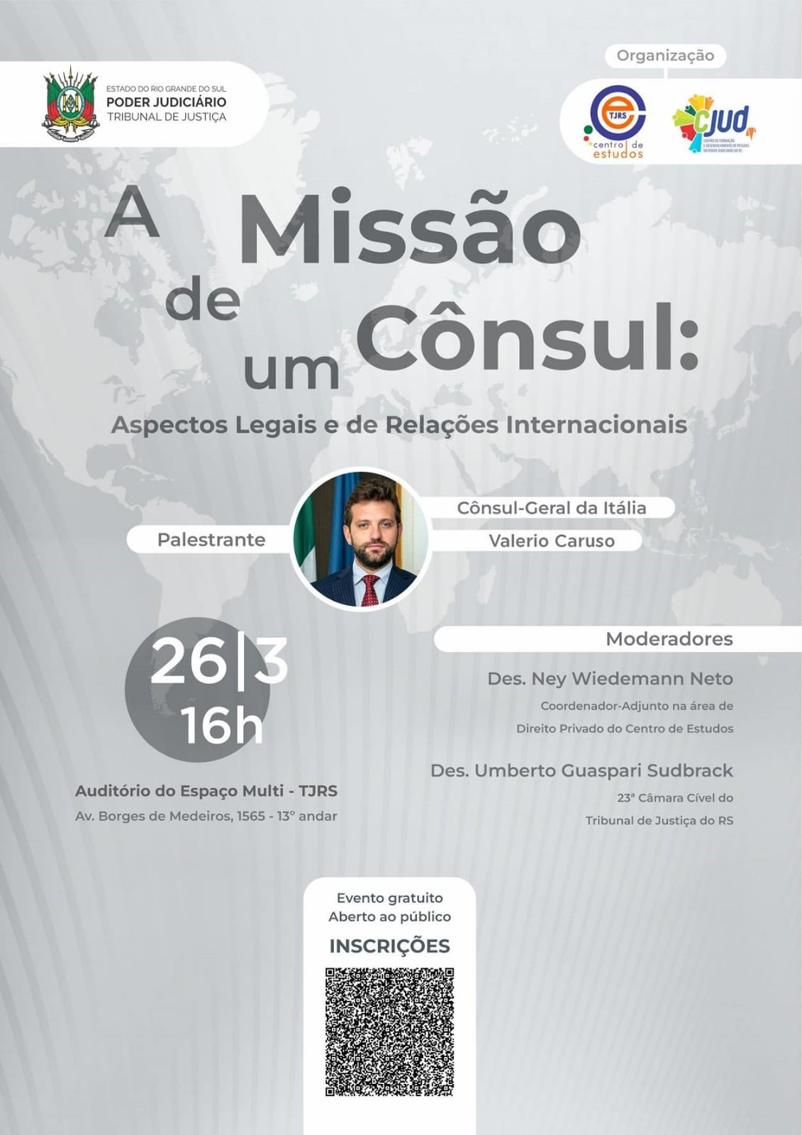 de Desenvolvimento de Pessoas do Poder Judiciário do Rio Grande do Sul - CJUD convidam para o evento presencial "A Missão de um Cônsul: Aspectos Legais